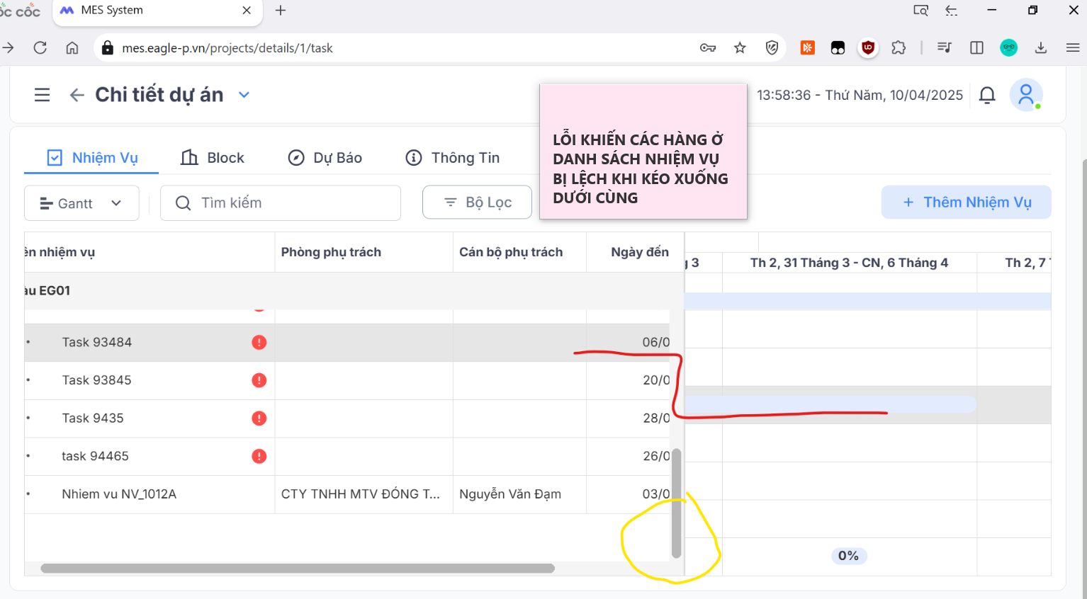 - Khi xem danh sách nhiệm vụ ở dạng Gantt, xuất hiện lỗi tại cuối danh sách mà khi kéo xuống quá đà (lăn chuột) sẽ khiến các hàng bên trái bị lệch so với các hàng bên phải.