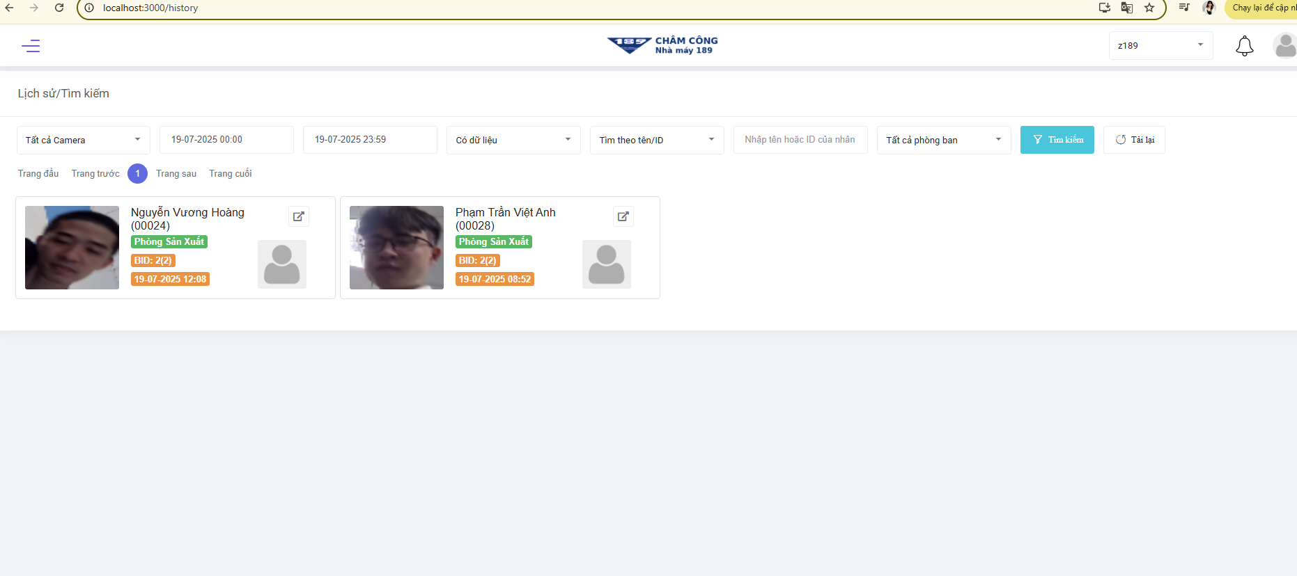 Chưa lấy log chấm công mặt ở mobile tại màn lịch sử/tìm kiếm chấm công trên web